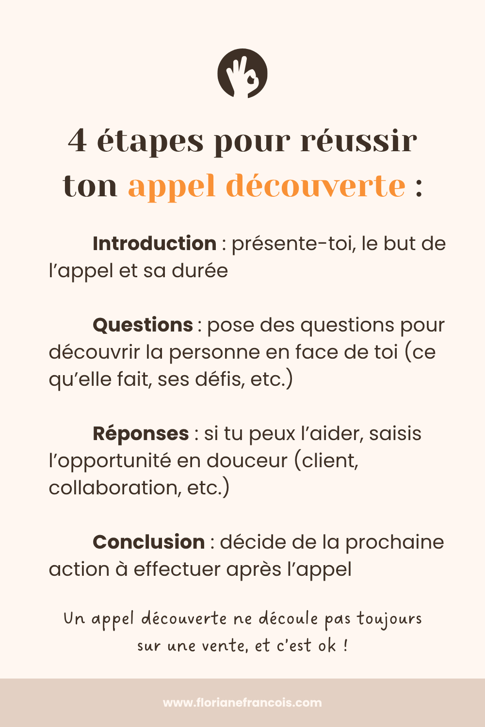 👉 Et souvenez-vous : tous les appels ne se concluent pas par une vente immédiate. Parfois, cela débouche sur une recommandation, une collaboration ou même une prise de contact ultérieure. Et c’est parfaitement ok ! Chaque échange contribue à renforcer votre crédibilité.